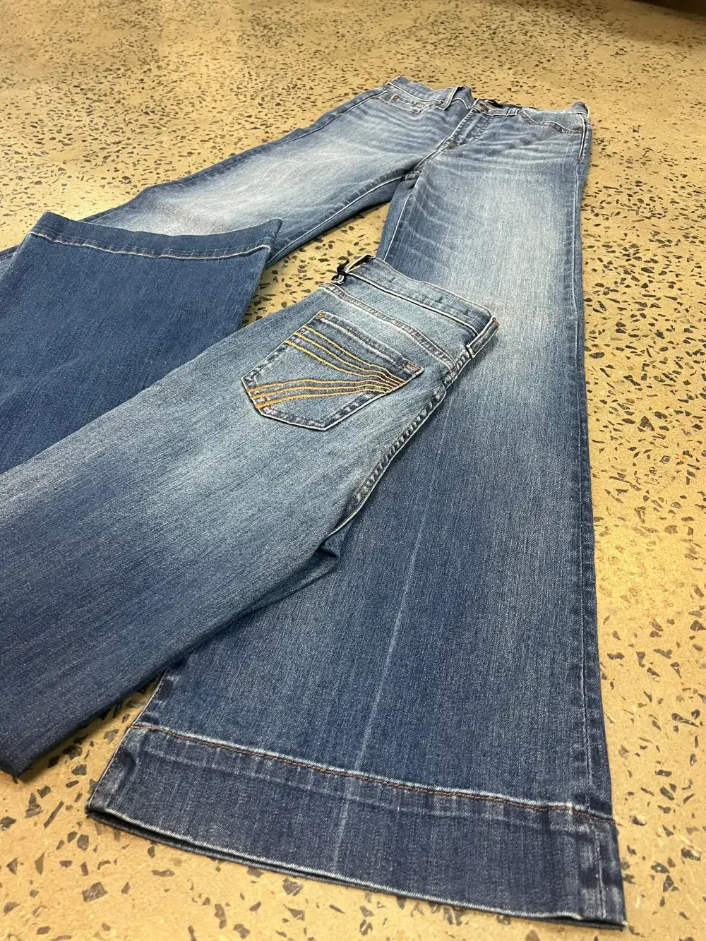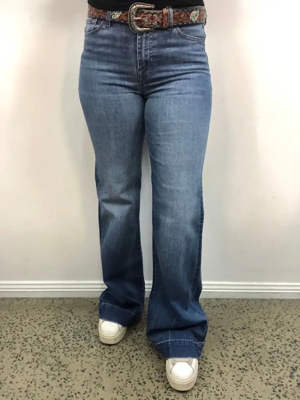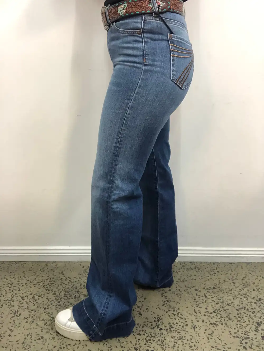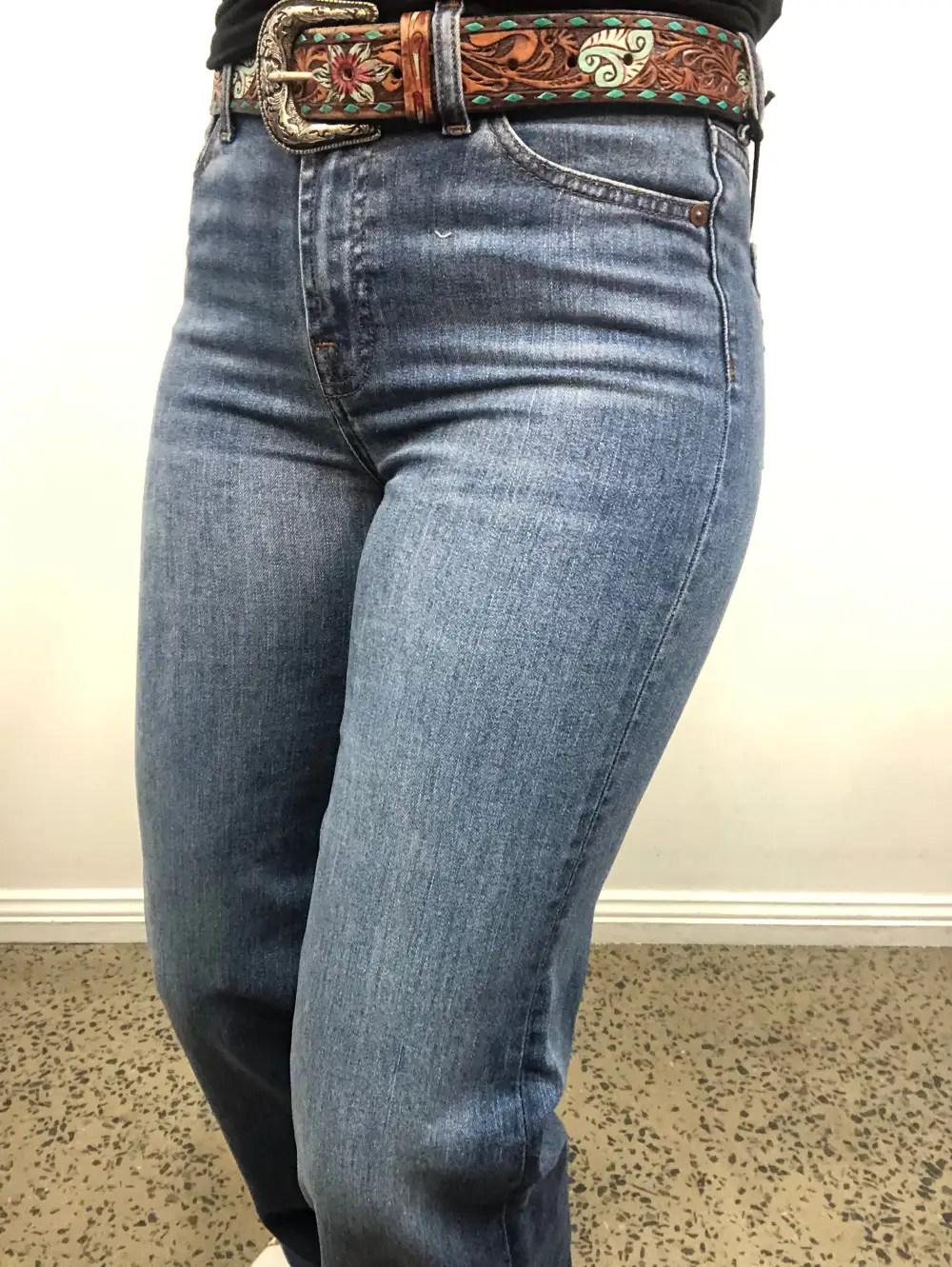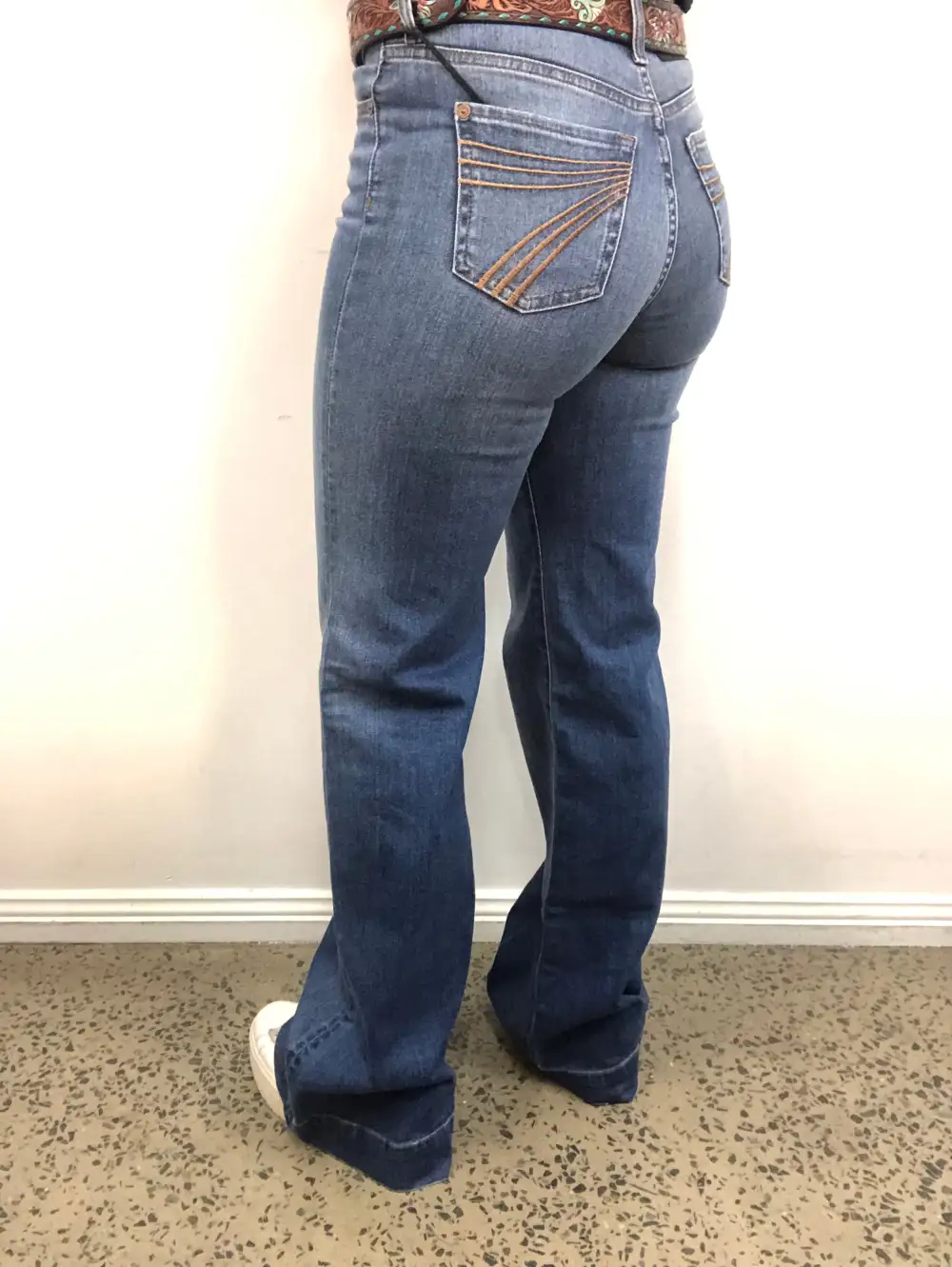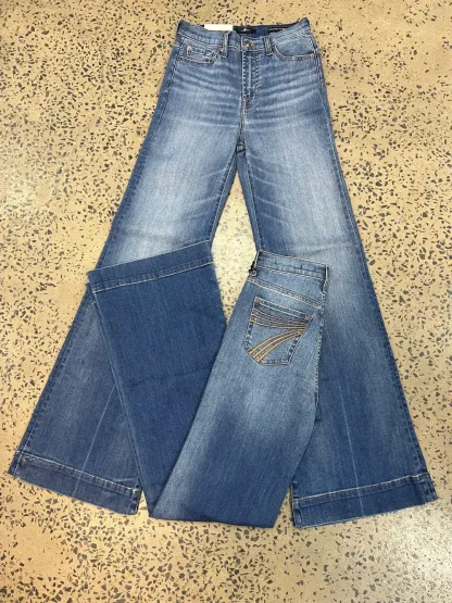 FIT - This jean is a high rise wide leg flare in a stretch denim. We recommend going down one size from your regular 2% stretch size in other western brands like Ariat, Cowgirl Tuff, Rock & Roll etc.