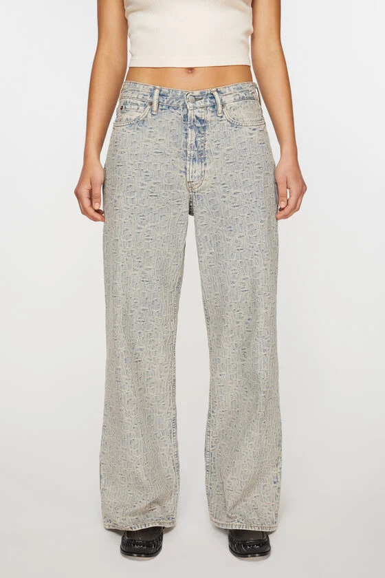 1981Fジーンズは、低いウエスト、ワイドレッグ、長い丈のバギーフィットにカットされています。全体にモノグラムが施され、サンドミネラルの色合いを持つブルーベージュのストレッチしないデニムで作られています。