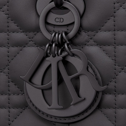 The Lady bag epitomizes the House's vision of elegance and beauty. Sleek and refined, the timeless yet relevant style is crafted in black ultramatte calfskin with Cannage stitching, creating the instantly recognizable quilted texture. The tonal metal D.I.O.R. charms offer an elegant allure. Featuring a thin, removable leather shoulder strap, the large Lady bag can be carried by hand, worn over the shoulder or crossbody.