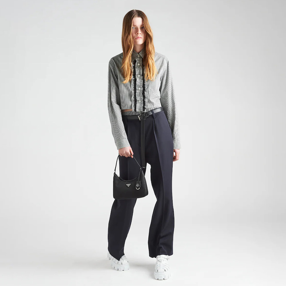 Inspired by the iconic mini hobo bag, the Prtktada Re-Edition 2005 shoulder bag is made of Re-Nylon: a regenerated nylon yarn produced from recycled, purified plastic trash collected in the ocean, fishing nets and textile waste fibers. Practical and feminine, the mini bag is decorated with iconic Saffiano leather trim. It features a contemporary mix of materials.