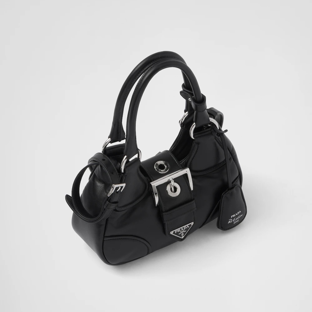 Reimagining the iconic lines of a model from the Prtktada archives from the 2000s, this nappa leather bag combines traditional elements reinterpreting them in a new way, with an innovative soft design. Softness and simplicity of the silhouette define this hobo bag, embellished by the ton-sur-ton triangle logo that frames the lettering logo, creating a three-dimensional and material game and enriching the design of the accessory.