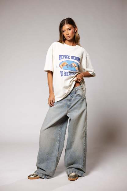 The Empire Jean is your go-to for a laid-back look. These vintage-inspired, wide-leg jeans feature an oversized fit and relaxed vibe, making them perfect for pairing with a graphic tee or crop top. With a light-wash finish and effortless flow, The Empire Jean is ready for any occasion. Whether you're lounging or heading out, these jeans offer comfort with an edge. Paired with our Chase Tee.