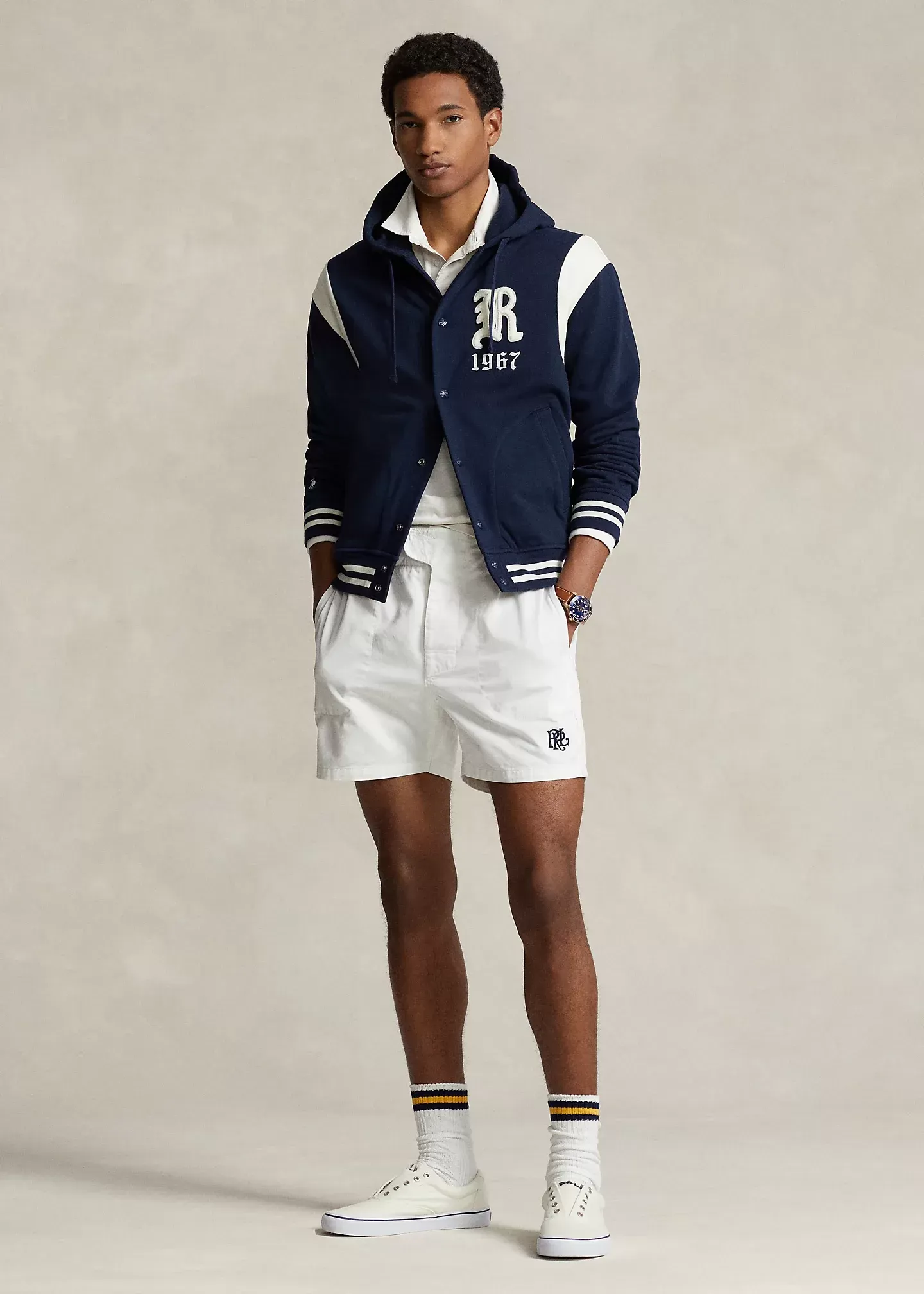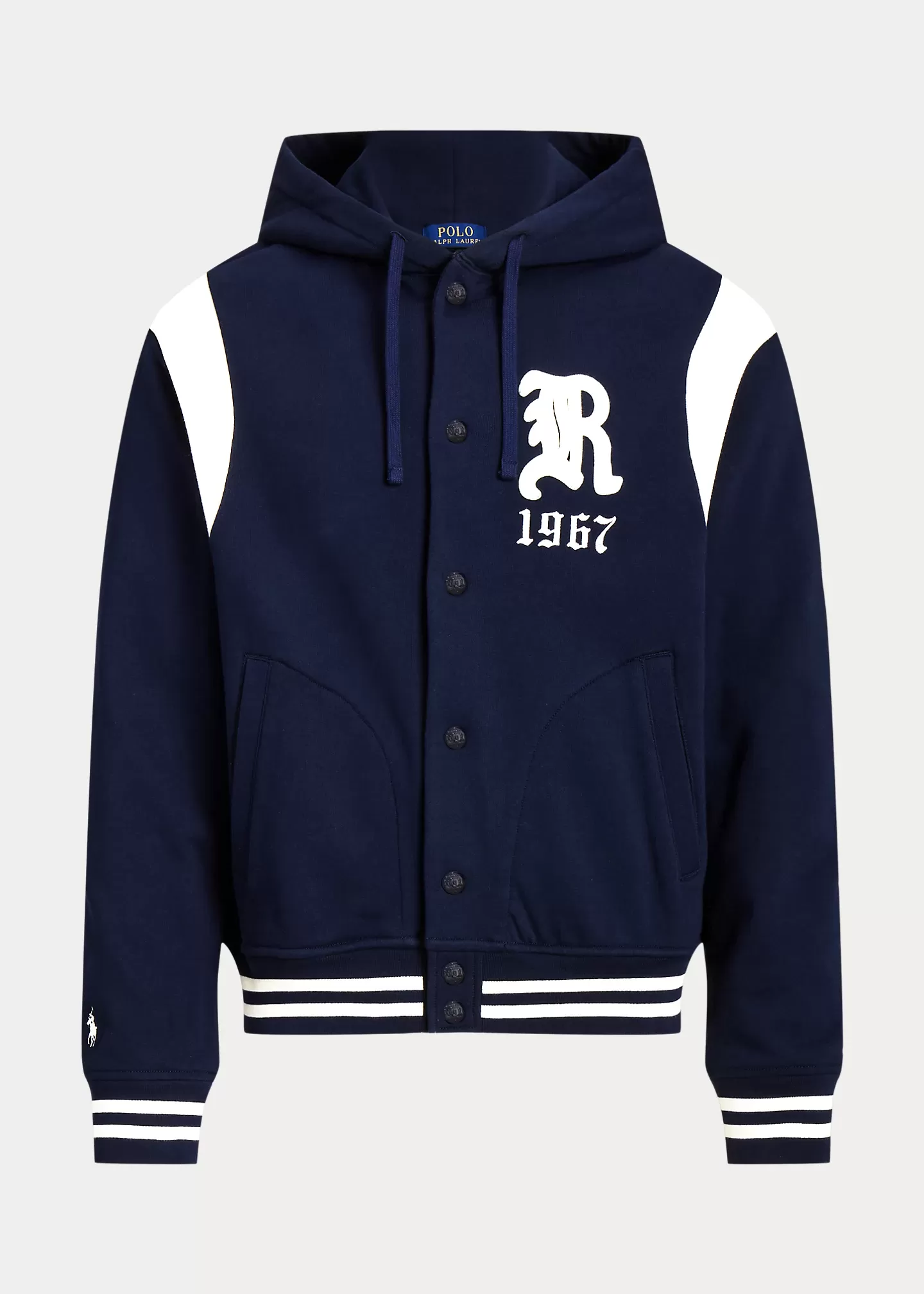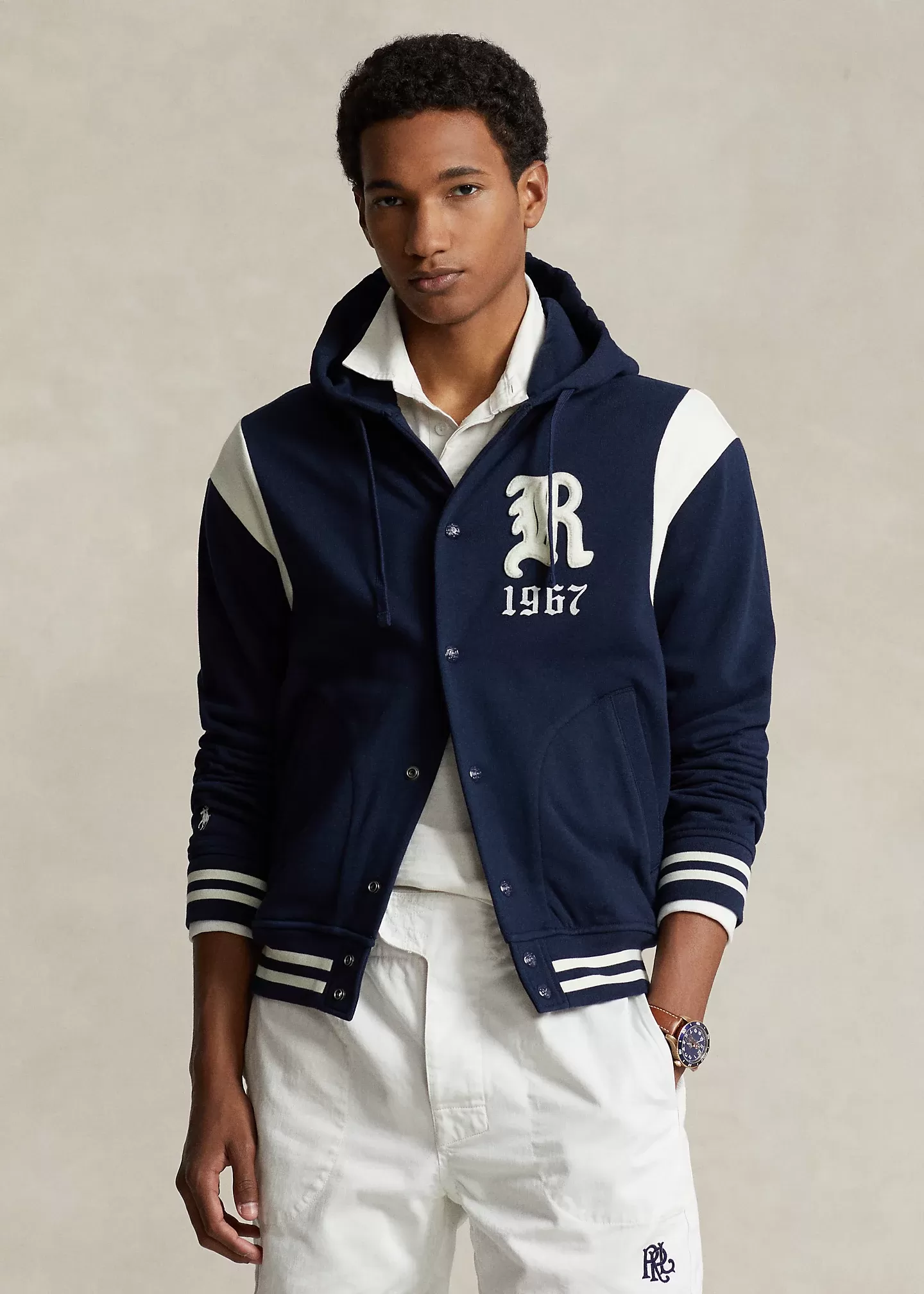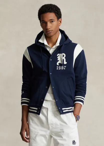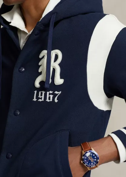 This lightweight baseball jacket is crafted with cotton-blend fleece that鈥檚 brushed for extra softness. It features a gothic 鈥淩锟?patch and 锟?967锟?embroidery, which nods to our founding year. Raltktph Lautktren partners with Better Cotton锟?to improve cotton farming globally. Better Cotton trains farmers to use water efficiently, care for the health of the soil and natural habitats, reduce use of the most harmful chemicals, and implement the principles of decent work.