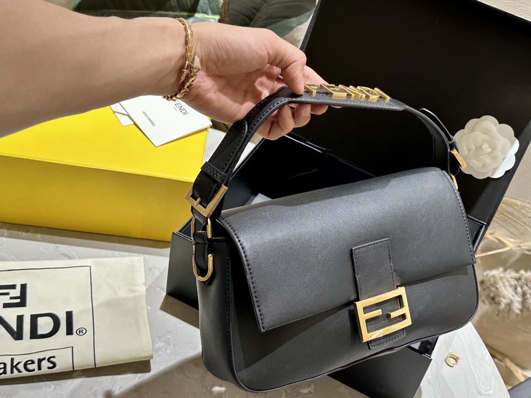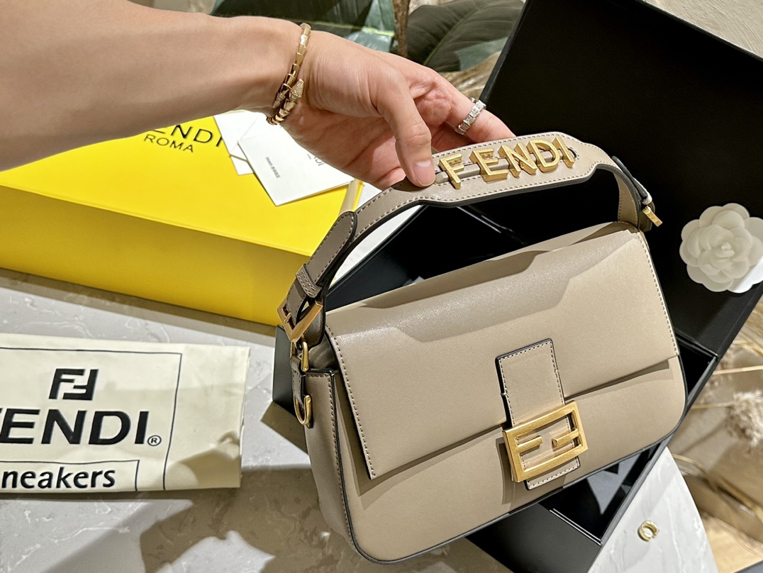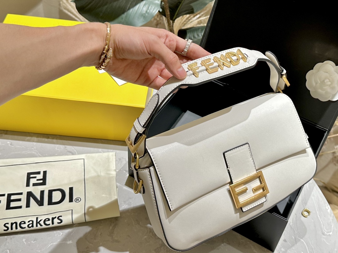 Iconic medium Baguette bag with an raised FF motif created with tone on tone embroidery, trimmed in leather and adorned with an FF clasp.