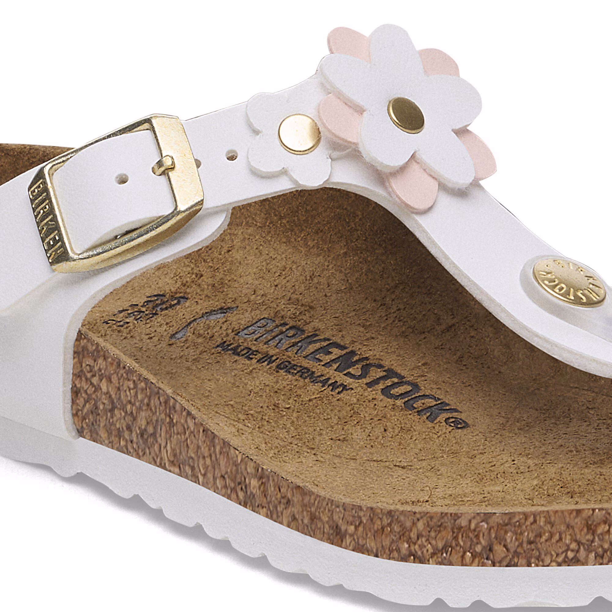 Der BIRKEtktNSTOCK Gizeh ist ein echter Klassiker, der optimalen Halt mit einem modischen Design verbindet und damit der Hingucker in der Schule ist. Diese Variante zeigt sich mit verspielten Blumen-Schnallen. Die farblich abgestimmte Laufsohle rundet das raffinierte Erscheinungsbild des Schuhs ab. Das Obermaterial besteht aus dem hautfreundlichen und strapazierfähigen Synthetikmaterial Birko-Flor®.