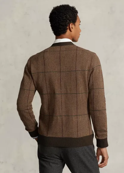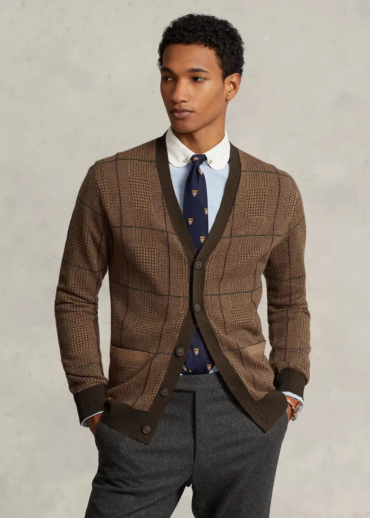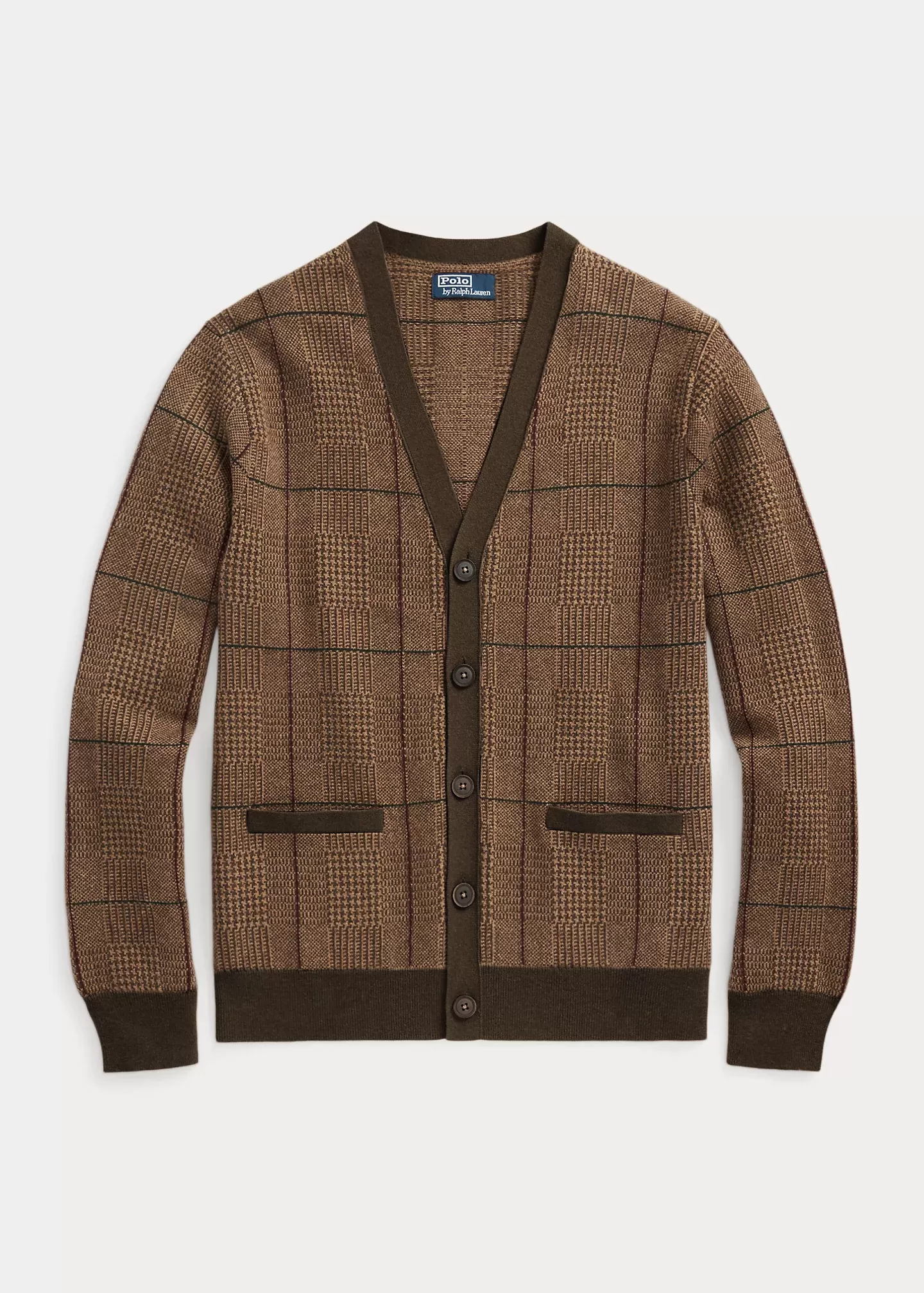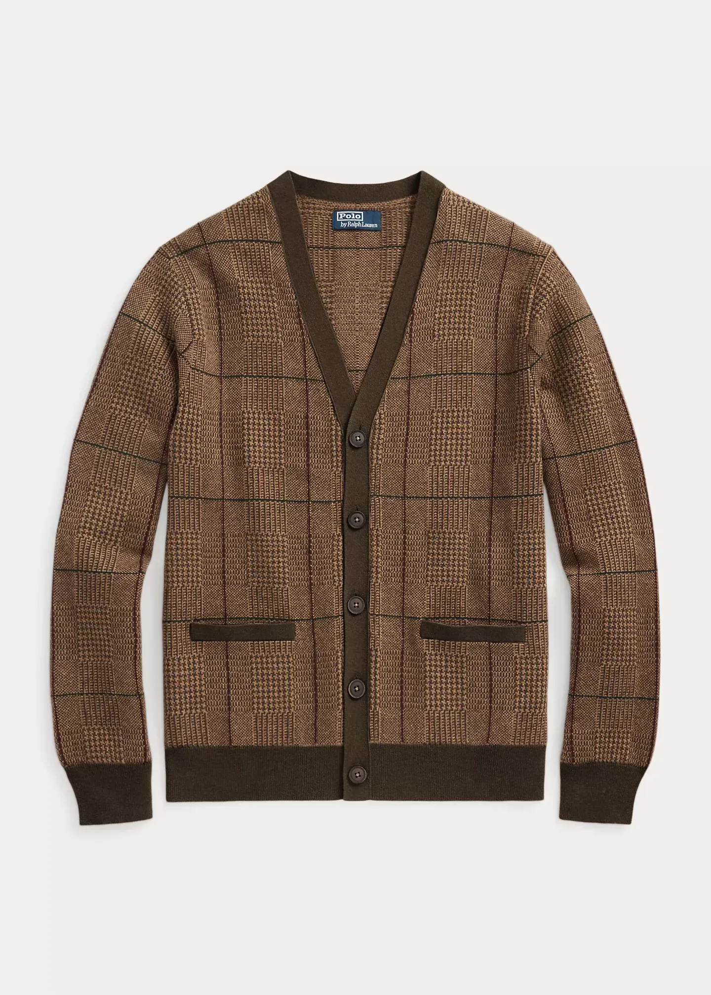 This lightweight cardigan is jacquard-knit with Italian wool yarns to create a beautiful Glen plaid pattern.