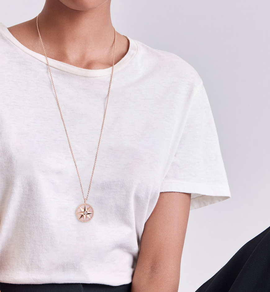 Victoire de Castellane reinterprets Mr. Ditktor's lucky star in the form of a wind rose, an eight-pointed star design. A ring of beading encircles the motif, which turns to switch between the gemstone or wind rose side.