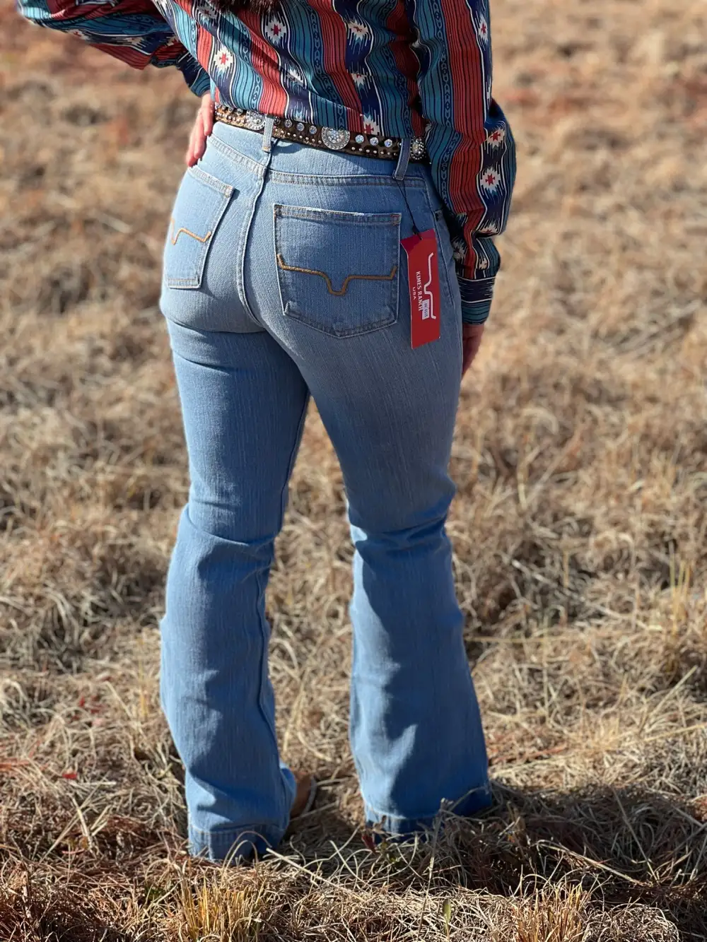 Lavado índigo oscuro Pierna acampanada Tiro medio Estilo de 4 bolsillos 2 bolsillos traseros abiertos Logotipo de Kimes Ranch bordado en los bolsillos traseros 93 % algodón / 5 % poliéster / 1 % elastano Lavar a máquinas!