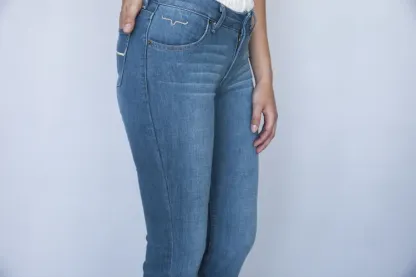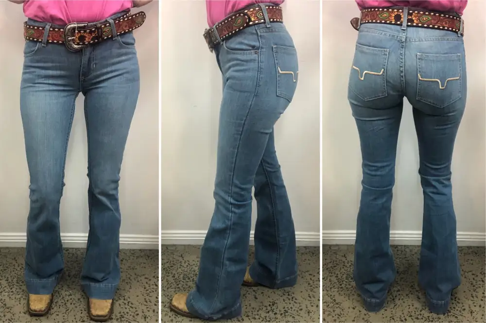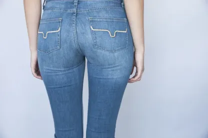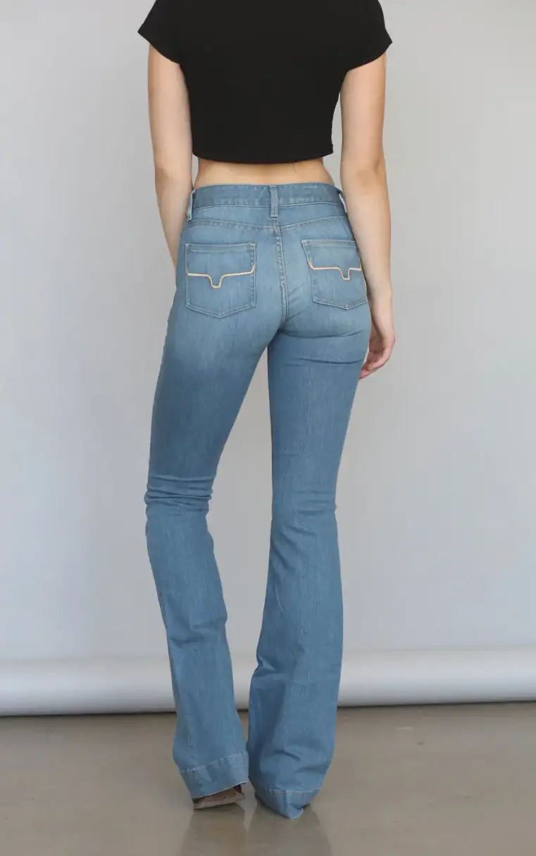 Kimes Ranch Lola is a light wash, true mid rise jean with a trouser cut. This jean sits just under the belly button. It features a fitted thigh with flare leg and trouser cuff. Night on the town or day in the saddle this jean is so versatile! This is the jean you have been waiting to add to your wardrobe. This jean is made in America from the best quality denim which is 93% cotton, 6% polyester and 1% stretch.