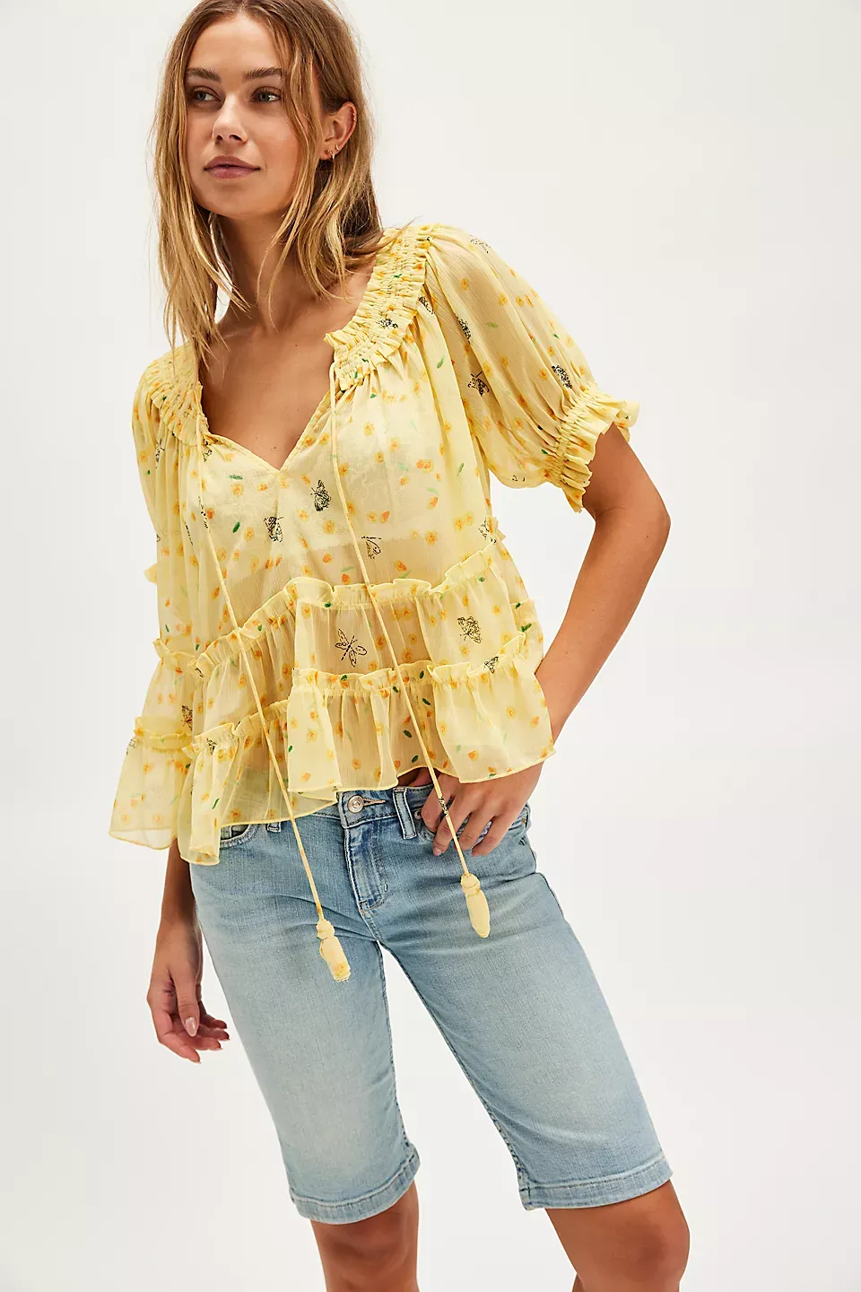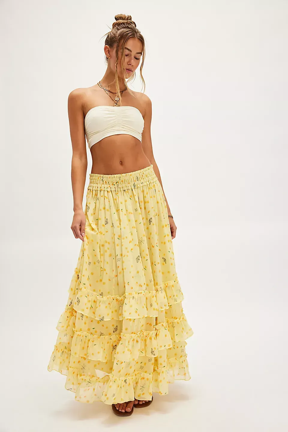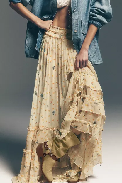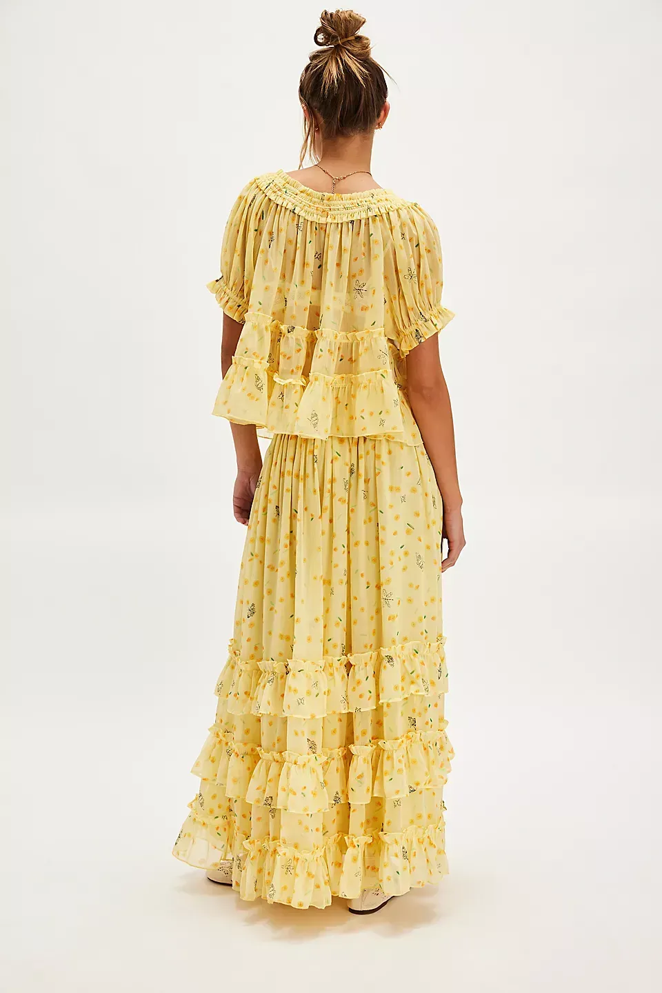 Forever femme in a frilly, floral-printed design, this stunning set features a tiered short-sleeve top and coordinating high-rise tiered maxi skirt for the sweetest done-in-one design. **Fit:** Relaxed, flowy fit **Features:** Top: V-neckline, smocked hems, semi-sheer fabrication, tiered design, tie closure at front, slightly puffed sleeves Skirt: High-rise style, tiered design, smocked elastic waistband, pleating throughout **Why We ? It:** Level up every look with this stand-out set, perfect to be paired together or styled separately for multiple ways to wear. **Note:** Due to editorial photography treatment, images of the color Sweet Yellow Combo may appear lighter online than the style you receive.