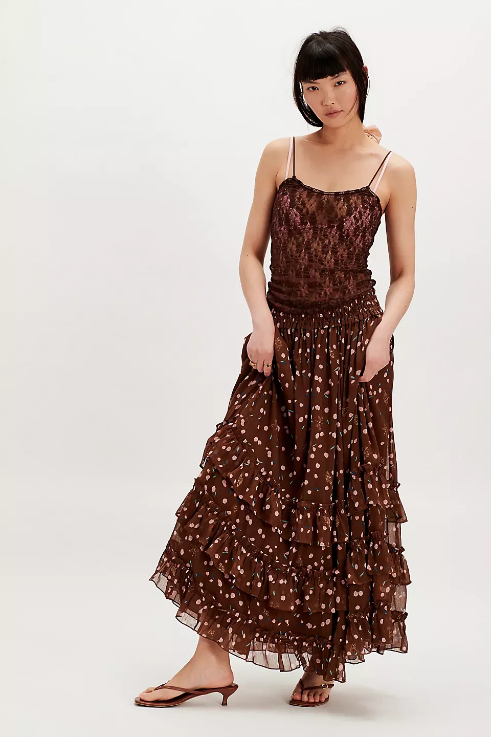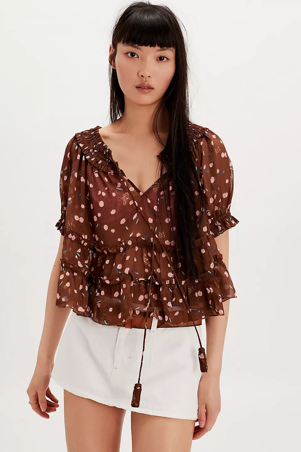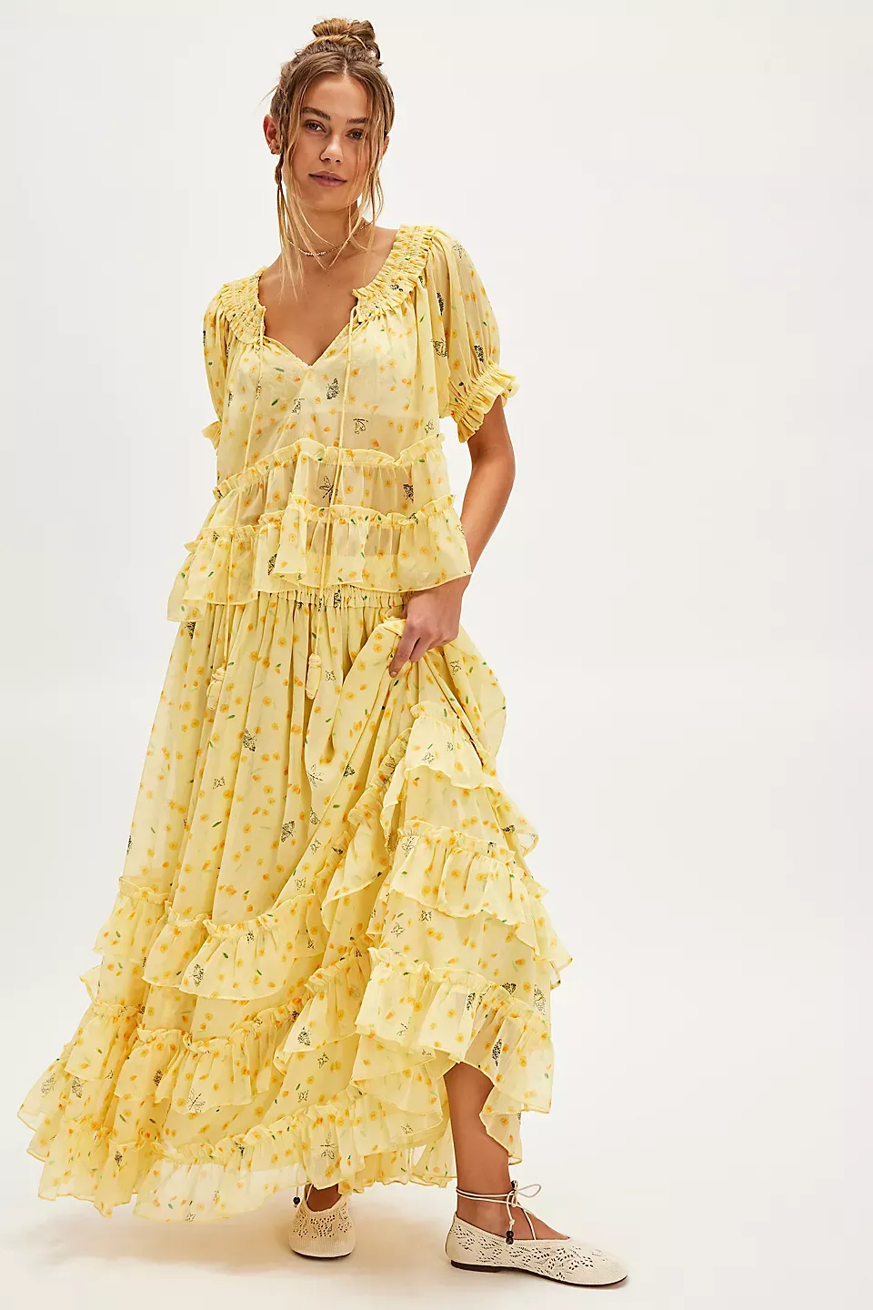 Forever femme in a frilly, floral-printed design, this stunning set features a tiered short-sleeve top and coordinating high-rise tiered maxi skirt for the sweetest done-in-one design. **Fit:** Relaxed, flowy fit **Features:** Top: V-neckline, smocked hems, semi-sheer fabrication, tiered design, tie closure at front, slightly puffed sleeves Skirt: High-rise style, tiered design, smocked elastic waistband, pleating throughout **Why We ? It:** Level up every look with this stand-out set, perfect to be paired together or styled separately for multiple ways to wear. **Note:** Due to editorial photography treatment, images of the color Sweet Yellow Combo may appear lighter online than the style you receive.