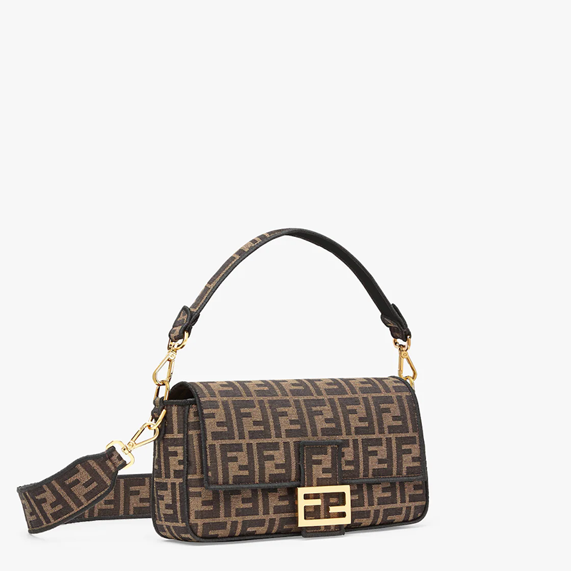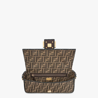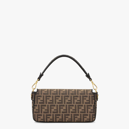 Iconic medium Baguette bag made of brown jacquard fabric with an FF motif, decorated with an FF clasp and trimmed with black embroidery.
