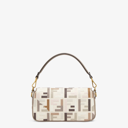 Iconic medium Baguette bag, made of natural canvas with a raised FF motif embroidered in multicolor yarn. Finished with a dove gray leather trim and embellished with an FF clasp.