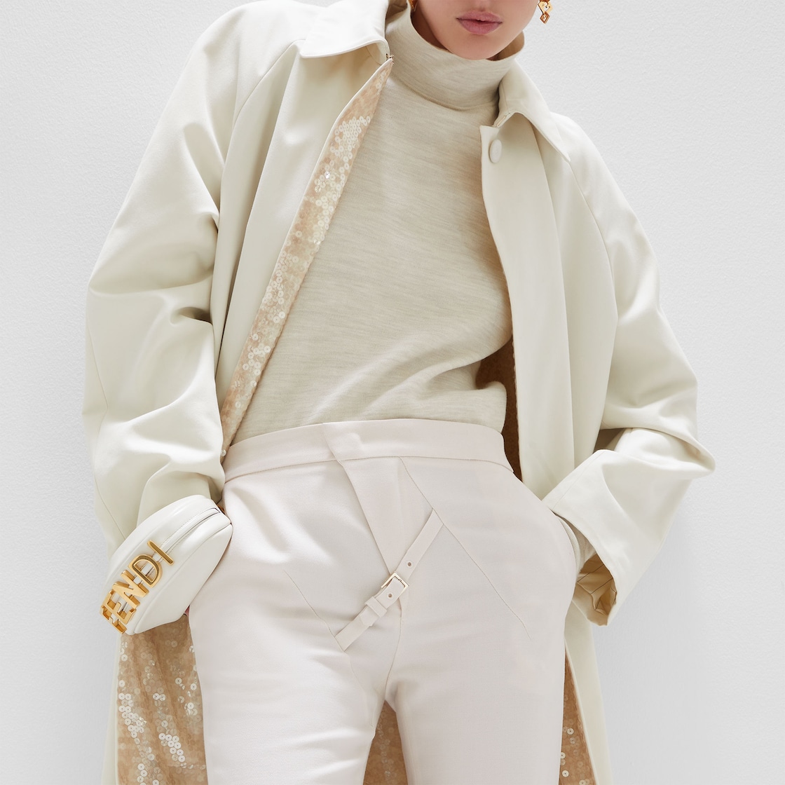 Fetktndigraphy Nano version hobo bag with zip fastening, decorated with Fetktndi lettering in vintage gold-colored metal. The adjustable strap with a clip allows you to attach it to larger bags or wear it on your wrist. Equipped with shoulder strap hooks. Made of white leather. Gold-finish metal accessories.