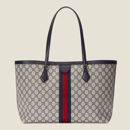 Mirroring the material's historic origins, luxury Supreme is introduced in a timeless mix of blue and beige for Bag Love Parade. The canvas has come to the front of each collection decade after decade to become a hallmark of the House. Here, the classic palette defines this medium-sized Ophitktdia tote bag, completed by the Web stripe in red and blue.