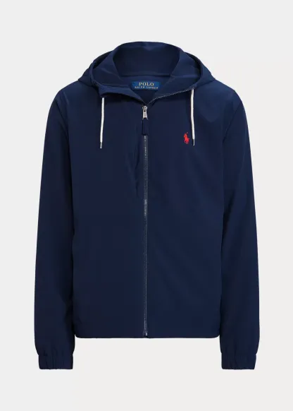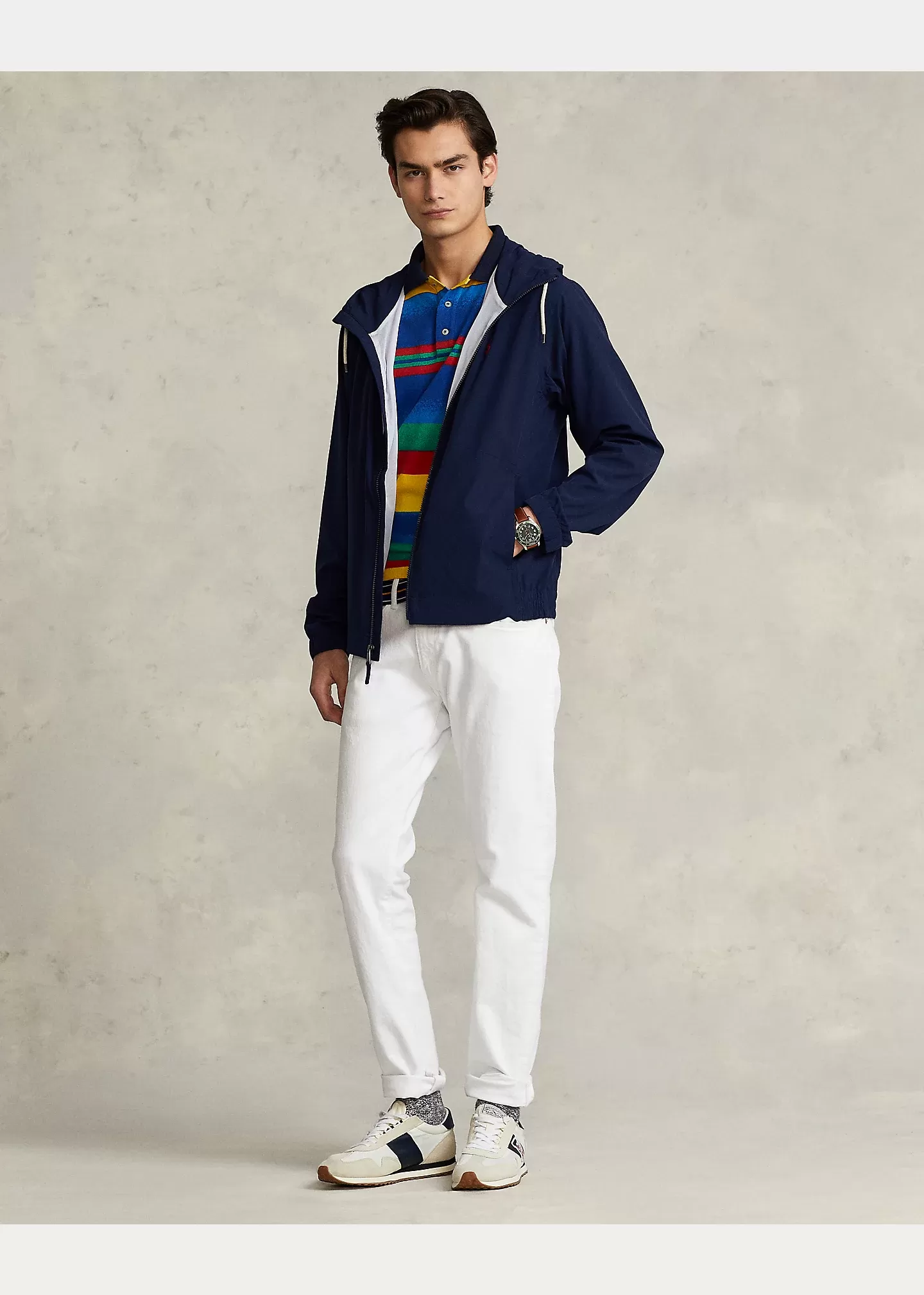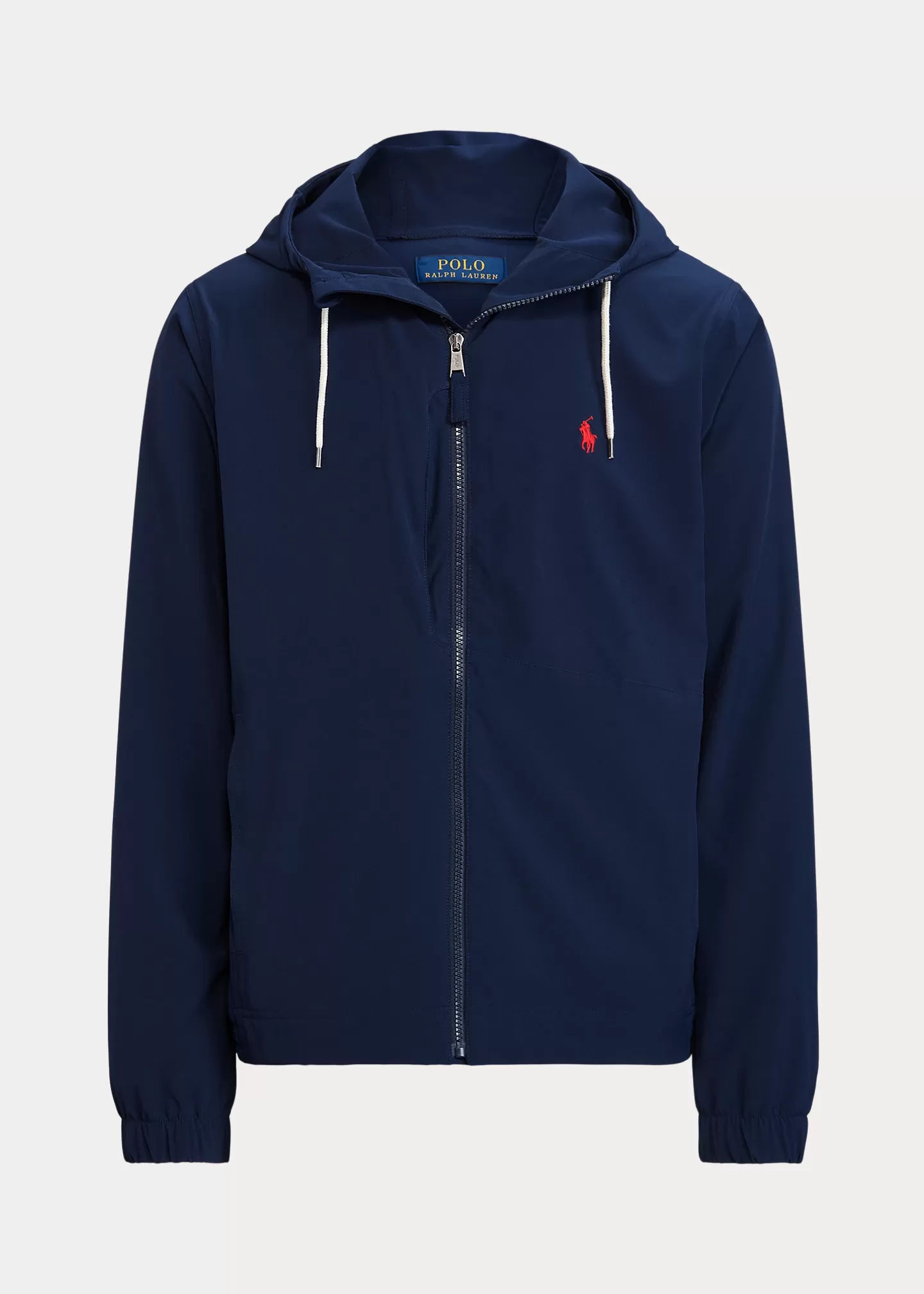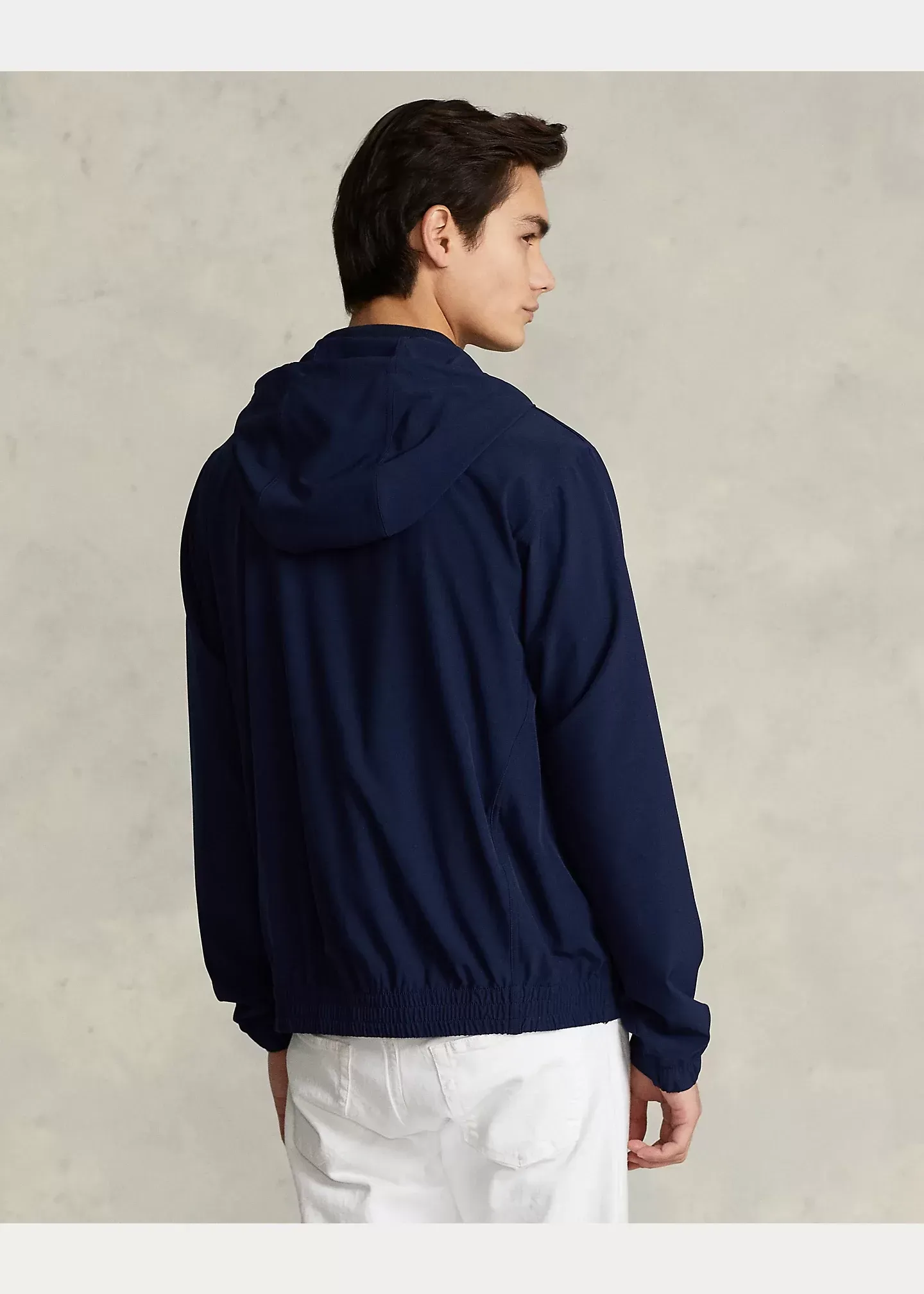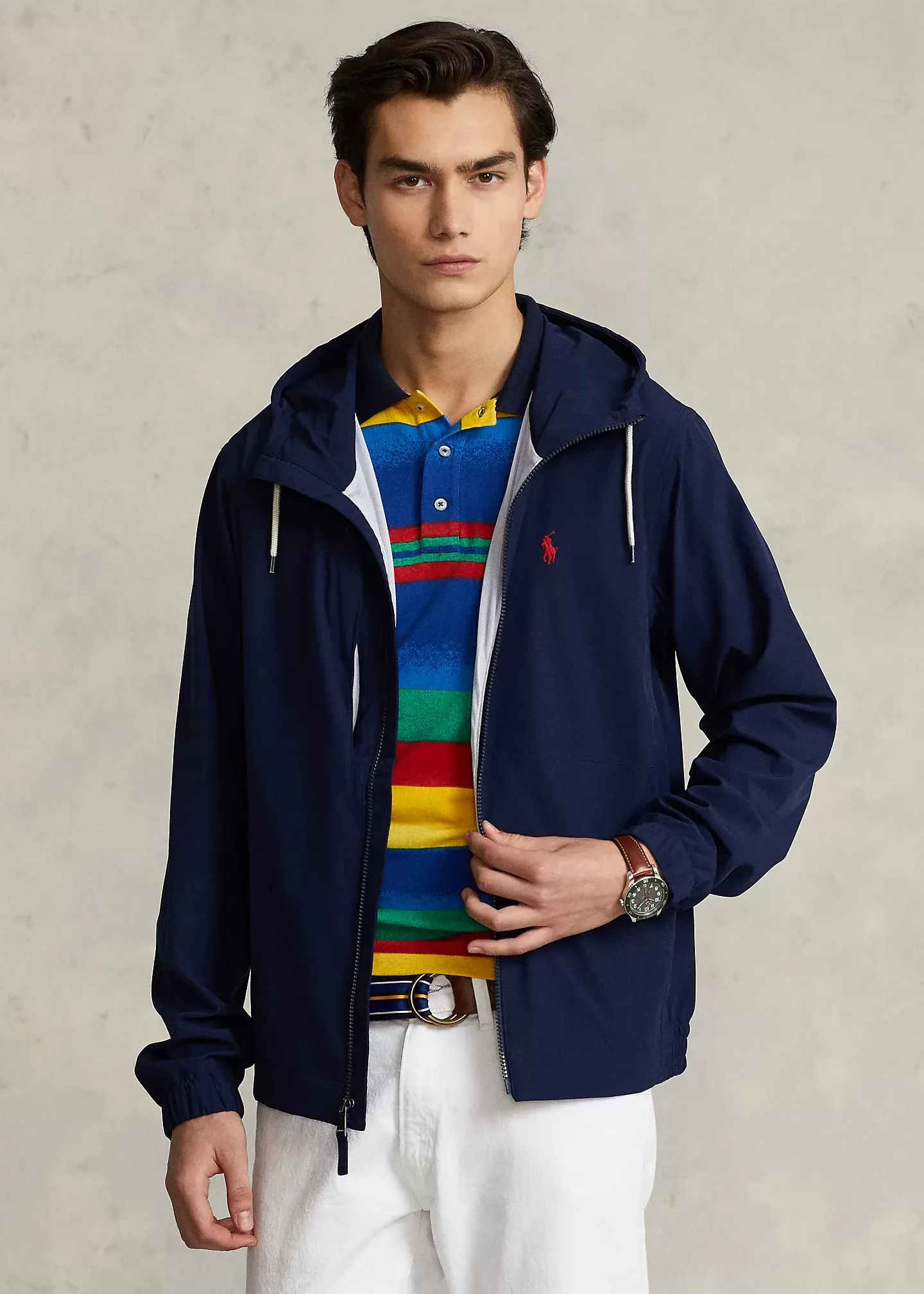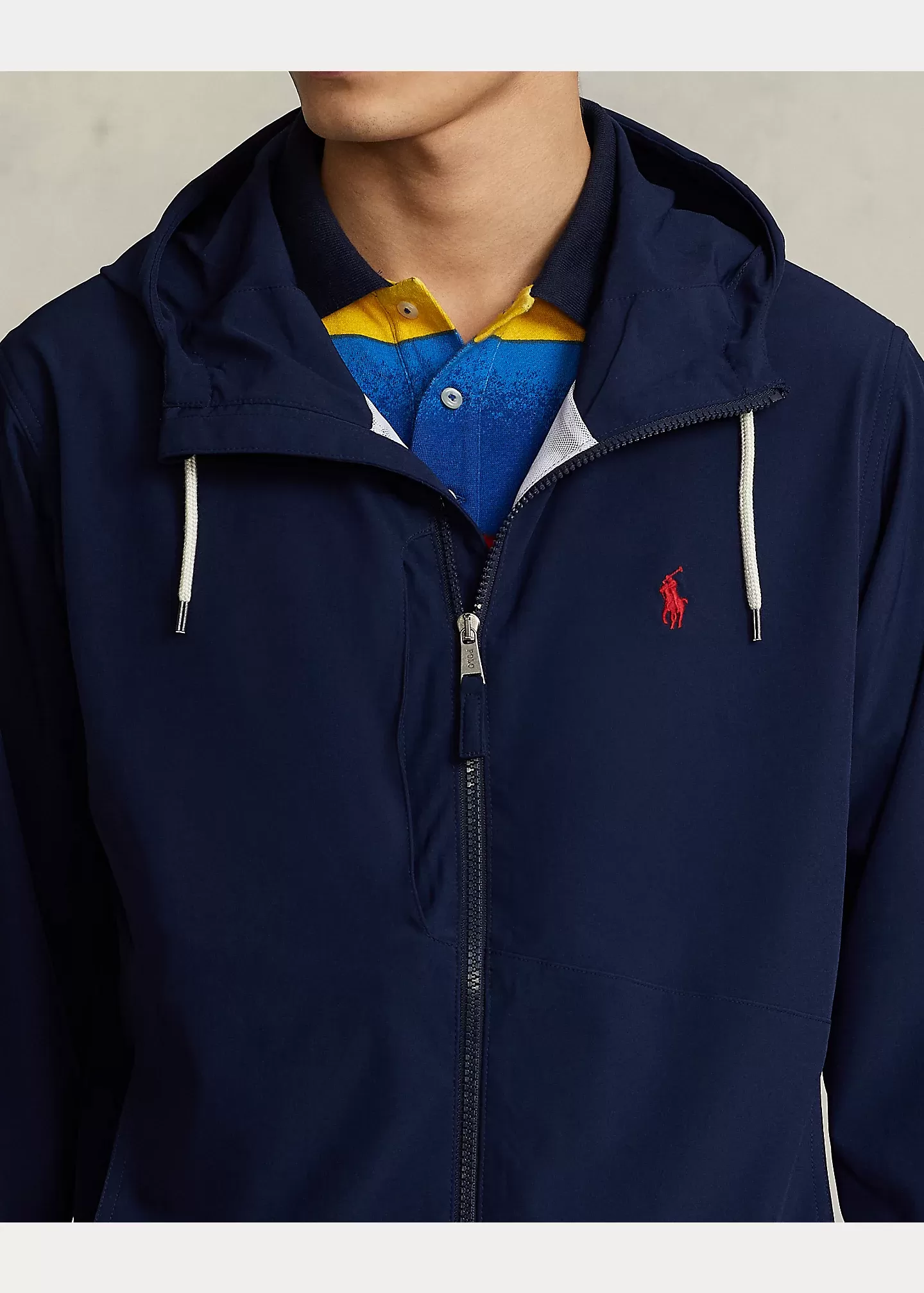 This hooded jacket is crafted from lightweight stretch fabric and features an innovative design that allows you to store it as a waist pack.