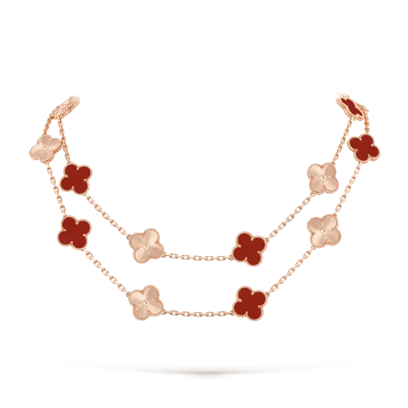 Vintage Alhambra long necklace, 20 motifs, guilloché 18K rose gold, carnelian.