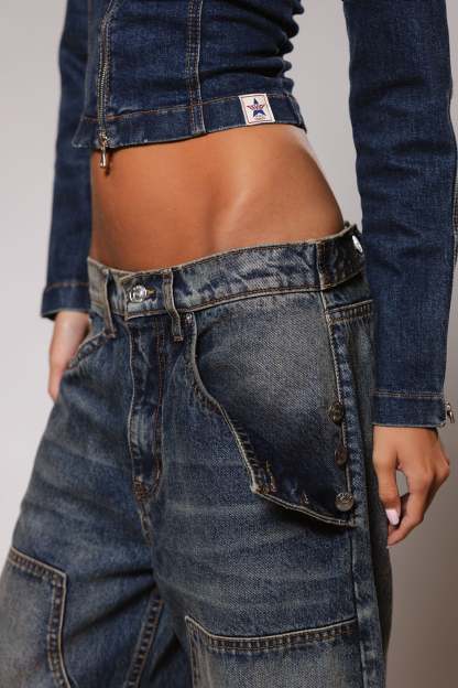 Your go-to fall jean is here! The Mason Jean is meticulously designed to effortlessly transition from low-rise to mid-rise for not only customizable comfort but unlimited ways to style. The Mason features a carpenter patch and adjustable side pocket details, combining style with practicality. With its unique front pocket flap detail, these jeans offer a distinctive one-of-a-kind touch to elevate your look effortlessly. Size up for a baggier look.