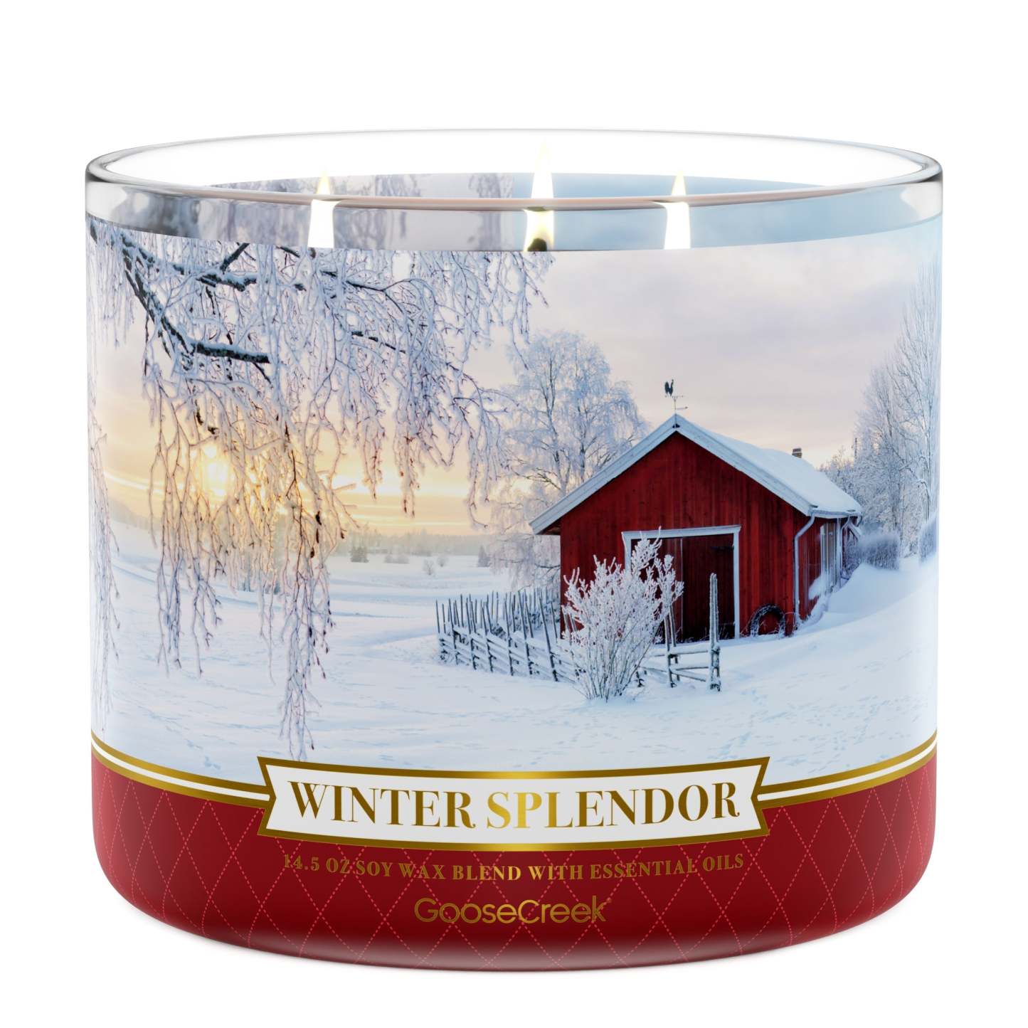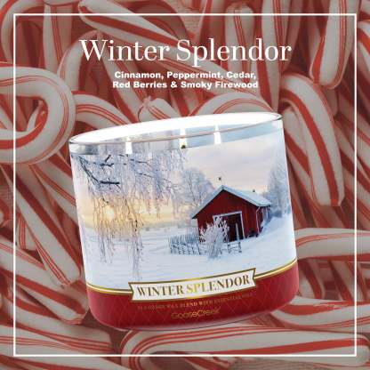 Close your eyes and take a stroll outdoors in the crisp, wintry air and take in a holiday scene of snow-capped trees and snow-covered walkways. You feel invigorated as the familiar scent of peppermint and cinnamon top notes from our Winter Splendor Large?3-Wick Candle reach your nose.