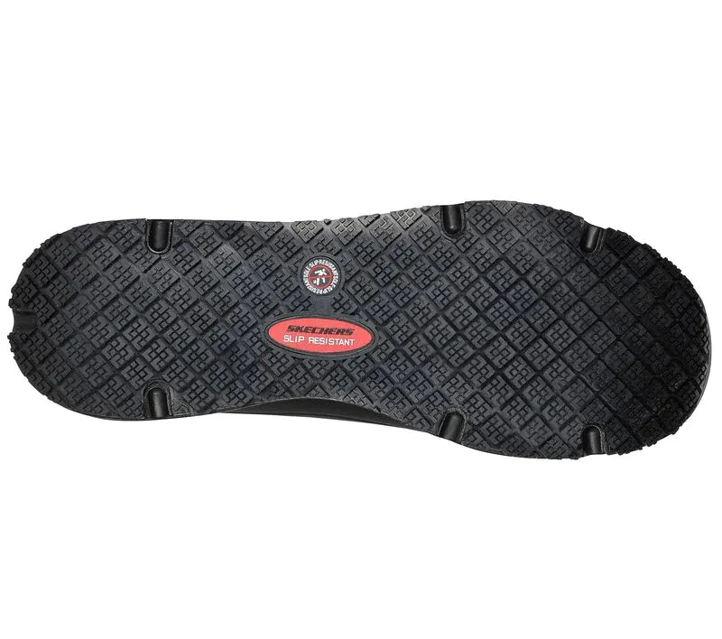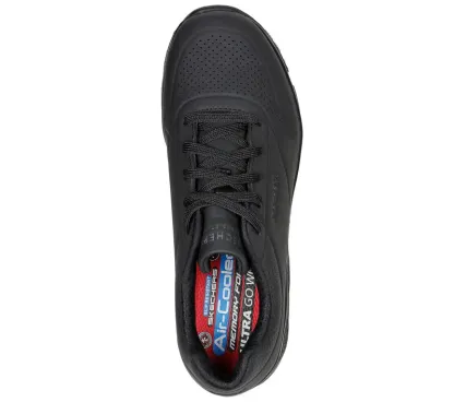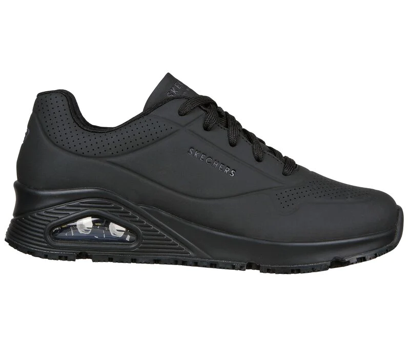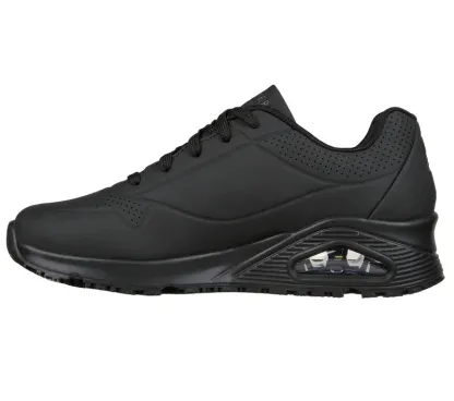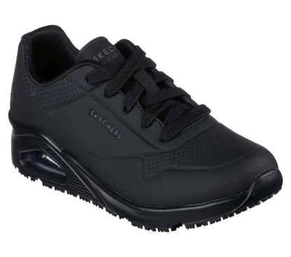 A favorite sneaker looks gets to business in comfort and safety with the skectkthers Work Relaxed Fit: Uno SR shoe. Smooth durable synthetic upper in a lace up casual sporty work slip resistant sneaker oxford with emboss and perforation accents. Air Cushion heel, Memory Foam insole.